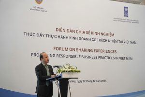 Luật sư Nguyễn Hưng Quang chia sẻ tại về thực tiễn thực hành kinh doanh có trách nhiệm thông qua hoạt động tư vấn của đội ngũ luật sư tại Diễn đàn chia sẻ kinh nghiệm thúc đẩy thực hành kinh doanh có trách nhiệm tại Việt Nam được tổ chức vào ngày ngày 12/12/2024 tại Hà Nội.
